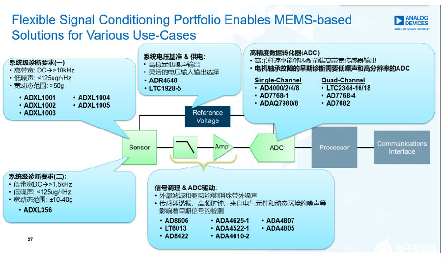 ADI除了MEM加速度傳感器,還可以在整個信號采集信號鏈上提供完整解決方案: