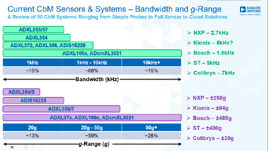 經(jīng)過對比不難發(fā)現(xiàn),兩款傳感器在靈敏度上非常接近,而ADXL1002隨頻率的相移相對于對比產(chǎn)品要小一半,底噪上壓電陶瓷要比MEMS小一些。在成本方面,Eason介紹,壓電陶瓷比MEMS高出許多——100vs30。以下是ADI常用于振動(dòng)監(jiān)測的加速度傳感器選型: