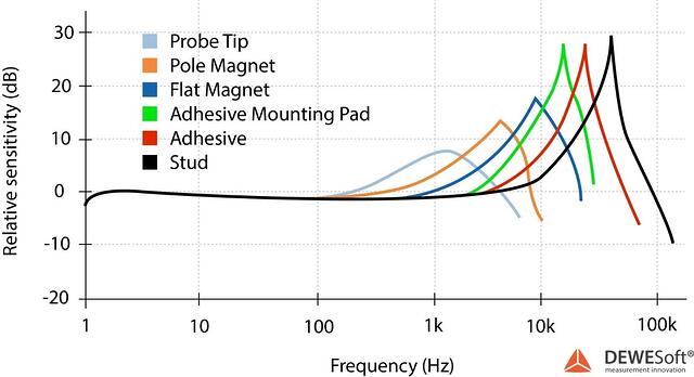 圖1: 不同安裝方式的加速度計的頻率響應(yīng)。從DEWESoft的“振動測量課程”中拍攝和修改的圖像(值得一試!)。