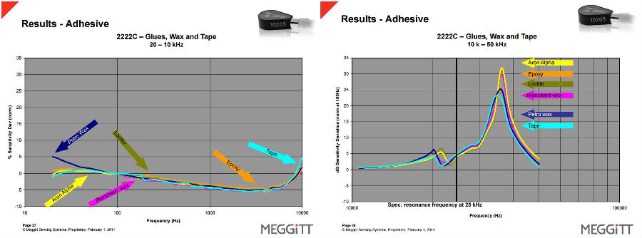 安裝加速度計時,需要考慮幾種不同的粘合劑。但是,令人驚訝的是,對于加速度計性能而言,最重要的參數(shù)不是膠粘劑類型,而是膠粘劑的厚度發(fā)揮了最大作用。圖4 提供了不同膠粘劑的頻率響應(yīng)的一些曲線圖(數(shù)據(jù)來自相同的Endevco展示),說明了兩者之間的微小差異。