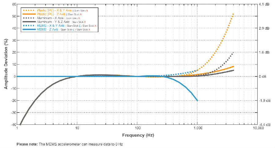 通常將帶寬指定為相對于參考頻率靈敏度(通常為100 Hz)的公差帶。可以以百分比和/或dB為單位指定公差帶,典型的頻段為±5%,± 10%, ±1 dB甚至±3 dB。大多數(shù)數(shù)據(jù)手冊都會提供典型的頻率響應曲線,以為用戶提供幫助。下面以enDAQ傳感器(以前為Slam Stick)的頻率響應為例(摘自數(shù)據(jù)表);它也方便地將分貝與百分比偏差進行比較。