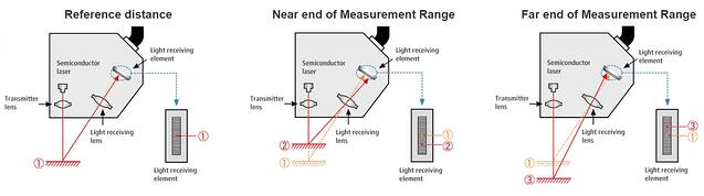 激光位移傳感器將三角測量與發(fā)射和接收透鏡配合使用。激光束通過透射透鏡射向目標(biāo)。然后,光反射回傳感器,并由接收器透鏡導(dǎo)向接收元件。隨著目標(biāo)越來越近,反射光的角度也會(huì)發(fā)生變化(聚焦在接收元件上的不同位置)。在防止使用加速度計(jì)(例如旋轉(zhuǎn)部件)的應(yīng)用中,或者在加速度計(jì)的質(zhì)量會(huì)對(duì)系統(tǒng)的運(yùn)動(dòng)產(chǎn)生太大影響時(shí),最好使用位移傳感器。