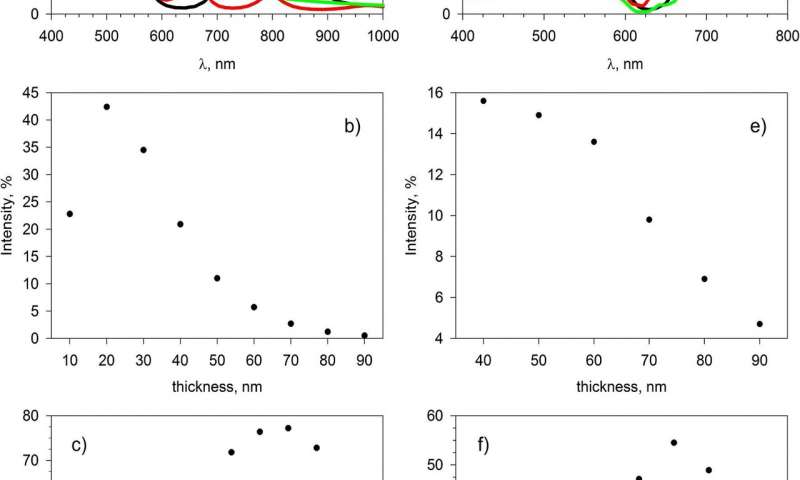 a)一維PC和PPC的透射光譜。虛線是PC的頻譜。粗線是具有30 nm Au層的PC的光譜。紅線是具有30 nm Au和270 nm緩沖層的PC的光譜。細線是30納米金層的透射光譜。b)對于Au層厚度的不同值,一維PPC的透射峰的強度。d)3D PC和PPC的透射光譜。虛線是PC的頻譜。粗線是具有40nm Au層(p極化)的PC的光譜。紅線是具有40nm Au和280nm緩沖層的PC的光譜。細線是具有40 nm Au層(s極化)的PC的光譜。e)繪制的3D PPC傳輸峰強度與金層厚度的關系 圖圖片來源:喀山聯(lián)邦大學