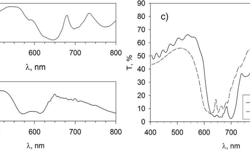 a)具有30 nm Au層的PPC的透射光譜。b)獨立的40納米金連續(xù)層的透射光譜。c)帶帽的PPC的透射光譜。虛線是獨立的40納米金制帽的光譜范圍 圖片來源:喀山聯(lián)邦大學