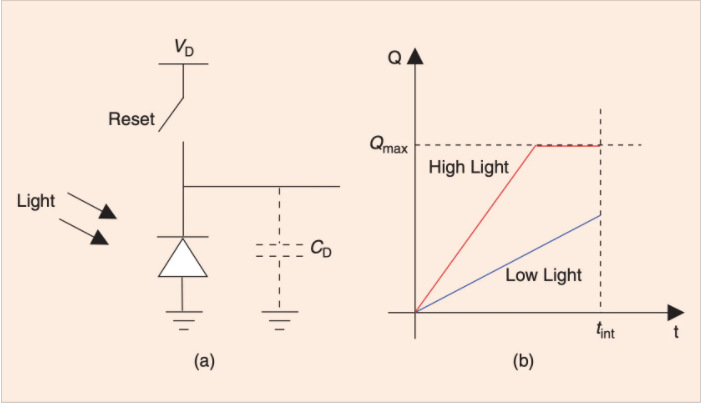 重置開關(guān)在曝光周期開始時閉合,以將光電二極管反向偏置到VD電壓。接下來,開關(guān)斷開,并產(chǎn)生與入射光強(qiáng)度成比例的光電流。該電流在毫微微安至皮安安的范圍內(nèi),并且太小而無法直接測量。如果我們讓光電二極管在設(shè)定的時間段內(nèi)(色調(diào))曝光,則電流將在二極管電容CD上積分。所存儲的電荷為我們提供了更容易測量的更強(qiáng)的累積信號。此外,合并的平均過程使累積的信號更真實(shí)地表示所測量的光強(qiáng)度,尤其是在處理微弱或嘈雜的信號時。