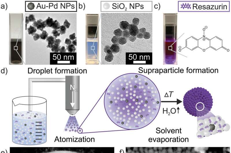 H 2指示劑 SP 的構(gòu)建模塊、制造和形態(tài)表征:a) Au-Pd NP 和 b) SiO 2 NP 分散體的數(shù)碼照片和 TEM 顯微照片;c) 刃天青染料水溶液的數(shù)碼照片;d) 通過(guò)液滴蒸發(fā)(使用噴霧干燥作為工具)將 SP 制造成自由流動(dòng)的紫色粉末的示意圖;e) SP 和 f) 其表面的 SEM 顯微照片。來(lái)源:先進(jìn)功能材料(2022)。DOI: 10.1002/adfm.202112379