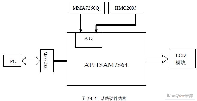 本系統(tǒng)的硬件結(jié)構(gòu)如圖2.4 -1 所示。 由于At91sam7s64 具有片上A/D 轉(zhuǎn)換器而且具有8 選1 模擬復(fù)用器,使得MMA7620Q 和HMC2003 可以直接與微控制器相連而不必外加A/D 轉(zhuǎn)換器和復(fù)用器,不僅降低了系統(tǒng)的 成本和體積,提高了系統(tǒng)的集成度,同時減少了誤差源,提高了精度。經(jīng)過A/D 轉(zhuǎn)換的測量數(shù)據(jù)經(jīng)過ARM 核的處理后,被送到串口LCD 并通過RS232 接口送入PC 機進(jìn)行進(jìn)一步 的分析。