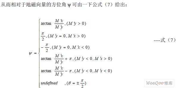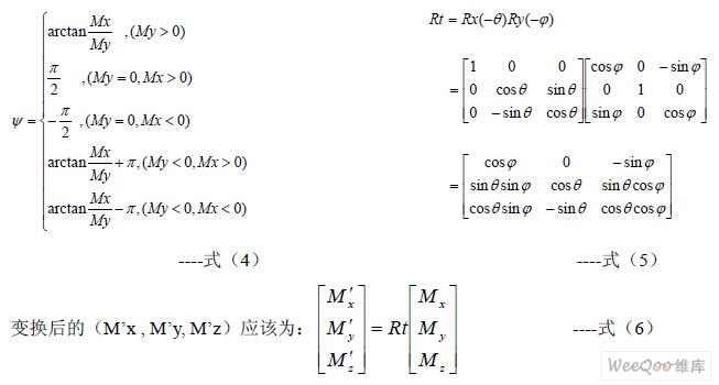 為了獲得系統(tǒng)相對于當(dāng)?shù)氐卮畔蛄康姆轿唤牵枰褂肕R 傳感器的三個輸出Mx, My, Mz 。當(dāng)系統(tǒng)置于水平狀態(tài)時(俯仰角和橫滾角都為0)時,方位角ψ 可以由公式(4)直 接給出,但是在大多數(shù)情況下,系統(tǒng)并不是工作在水平狀態(tài),此時地磁場的豎直分量將會影 響Mx 和My 的值,因此不能直接由公式(4)獲得相對于地磁向量的方位角。為了在所有 情況下都能獲得正確的方位角,必須將俯仰角和橫滾角考慮在內(nèi),即必須通過以俯仰角和橫 滾角為參數(shù)的坐標(biāo)變換,將測得的(Mx, My, Mz)向量變換為與載體坐標(biāo)系有相同方位角的 水平坐標(biāo)系下的向量(M’x , M’y, M’z),其變換矩陣如公式(5)。
