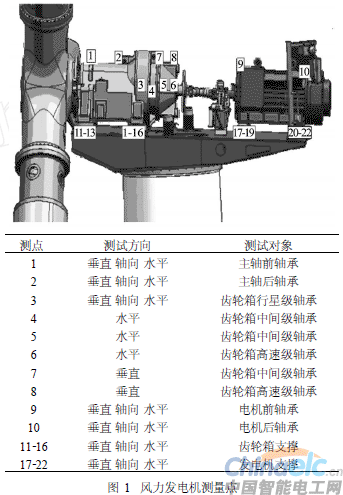 現場測量點的布置對于風力發(fā)電機在線監(jiān)測和診斷系統來說一直是個難題,至今也沒有得到很好的解決,F場測量點選擇的不同,對于監(jiān)測系統信號分析具有很大的影響。不同的布置方案,得到的結果不盡相同。