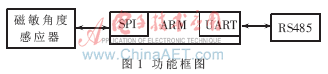 基于磁敏技術(shù)的位移傳感器主要由3個部分組成,前端角度信號采集、數(shù)據(jù)處理單元、數(shù)據(jù)通訊單元,具體的功能框圖如圖1所示。