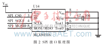 MLX90316具備1路SPI接口,用于角度信號的數(shù)據(jù),由于串行通信的輸出信號直接來自于內(nèi)部DSP輸出,SPI輸出模式更穩(wěn)定,誤差更小,并且具有更高的抗干擾能力,在本設(shè)計中,選用SPI接口,具體的硬件接口連接電路如圖2所示。在圖2中,MLX90316的SPI 3根線與LPC2136的SPI0口連接。SPI(Serial Protocol Interface)總線接口是一種同步串行外設(shè)接口。這是一個4根信號線的串行接口協(xié)議,包括主、從兩種模式。這4根信號線分別是:時鐘線(SCK)、數(shù)據(jù)輸入線(MISO)、數(shù)據(jù)輸出線(MOSI)和從設(shè)備使能線(/SS)。
