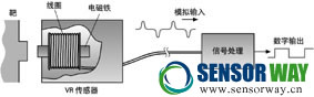 ---- 當(dāng)靶的凸出部分(例如齒輪的輪齒)運(yùn)動(dòng)接近到傳感器,此時(shí)磁通量最大。當(dāng)靶的凸出部分離去,磁通量跌落。靶的運(yùn)動(dòng)結(jié)果引起磁通量隨時(shí)間變化,這在線圈中感應(yīng)出成比例的電壓,以后的電路(信號(hào)處理電路)將輸入信號(hào)變成數(shù)字波形(脈沖),它能更容易計(jì)數(shù)及時(shí)間控制。