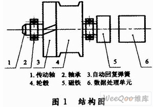 基于磁敏角度技術(shù)的拉線式位移傳感器的功能是將拉線的機(jī)械位移換成可以計(jì)量、記錄或傳送的電信號,主要由自動(dòng)回復(fù)彈簧、輪轂、磁鐵以及數(shù)據(jù)處理單元等部分構(gòu)成,結(jié)構(gòu)如圖1所示。