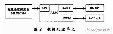 數(shù)據(jù)處理單元由磁敏角度感應(yīng)器、微處理器單元、通信接口以及輸出模塊,具體的功能框如圖2所示。