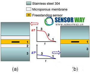 近日,中國(guó)科學(xué)院工程熱物理研究所傳熱傳質(zhì)研究中心科研人員針對(duì)這一微尺度熱物性測(cè)量難題進(jìn)行了較深入研究?蒲腥藛T提出了一種自適應(yīng)基于獨(dú)立型傳感器的3ω技術(shù)(圖1、圖2),通過分別測(cè)試5層對(duì)稱結(jié)構(gòu)(基底-微孔膜-傳感器-微孔膜-基底)及作為對(duì)照組的3層對(duì)稱結(jié)構(gòu)(基底-傳感器-基底)的獨(dú)立型傳感器的溫度響應(yīng)信號(hào)(圖1),結(jié)合提出的數(shù)學(xué)模型,可以較為準(zhǔn)確地得到數(shù)十微米厚微孔膜的有效熱導(dǎo)率。