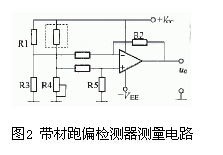 圖2為測量電路簡圖。R1、R2是同型號的光敏電阻。R1作為測量元件裝在帶材下方,R2用遮光罩罩住,起溫度補償作用。當帶材處于正確位置( 中間位)時,由R1、R2、R3、R4組成的電橋平衡,使放大器輸出電壓U0為0。當帶材左偏時,遮光面積減少,光敏電阻R1阻值減少,電橋失去平衡。差動放大器將這一不平衡電壓加以放大,輸出電壓為負值,它反映了帶材跑偏的方向及大小。反之,當帶材右偏時,U0為正值。輸出信號U0一方面由顯示器顯示出來,另一方面被送到執(zhí)行機構,為糾偏控制系統(tǒng)提供糾偏信號。