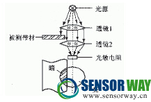 光電式帶材跑偏檢測器原理如圖1所示。光源發(fā)出的光線經過透鏡1會聚為行光束,投向透鏡2,隨后被會聚到光敏電阻上。在平行光束到達透鏡2的途中,有部分光線受到被測帶材的遮擋,使傳到光敏電阻的光通量減少。