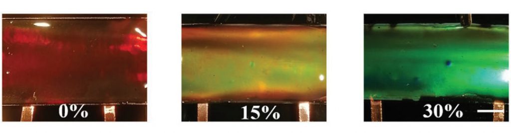 為了進(jìn)一步開發(fā)這種功能性水凝膠的功能,研究人員應(yīng)用了一種結(jié)構(gòu)著色技術(shù),該技術(shù)也源自自然界。結(jié)構(gòu)性著色使孔雀的羽毛閃爍,并有助于偽裝變色龍。代替顏料,而是使用會(huì)干擾可見光的微觀結(jié)構(gòu)表面來創(chuàng)建顏色。