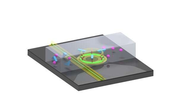泵浦光耦合到設(shè)備,在微環(huán)諧振器中產(chǎn)生激光。諧振器的表面裝有捕獲感興趣的分析物的探針(環(huán)上的紅色錨分子)。環(huán)中的激光延伸到流體中。當(dāng)感興趣的分析物(藍(lán)色三角形)附著在捕獲探針上時(shí),微環(huán)激光器外部的場(chǎng)會(huì)感應(yīng)到這種情況,從而改變了激光發(fā)射的頻率。可以非常精確地測(cè)量此偏移,從而可以檢測(cè)到以“特定”方式流過傳感器的微量分析物(即,粉紅色顆粒沒有與捕獲層結(jié)合,因此無法檢測(cè)到)。在圖中,波導(dǎo)是綠色的(由誘導(dǎo)激光發(fā)射的摻雜劑的上轉(zhuǎn)換產(chǎn)生的真實(shí)顏色),并且可以看到微流體通道,其中不同的顆粒從左到右流動(dòng)。圖片來源:Rick Seubers,特溫特大學(xué)光學(xué)科學(xué)組