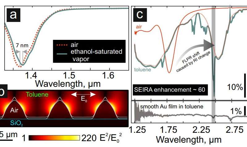 一階晶格等離子體共振(FLPR)的各種應(yīng)用a)由注入飽和乙醇蒸氣引起的納米空隙陣列SP傳感器的光譜響應(yīng)。(b)在2.5μm波長的線性極化光源從頂部激發(fā)納米空隙陣列的表面附近時(shí),計(jì)算出的平方化歸一化EM場振幅E2 / E2 0靠近甲苯。(c)在空氣中和在甲苯液體層下的納米空隙陣列的FTIR反射光譜。如果不吸收甲苯,則虛線表示納米空隙陣列對反射光譜的貢獻(xiàn)。底部面板顯示了在相同條件下從被甲苯覆蓋的光滑Au膜表面反射的FTIR反射。