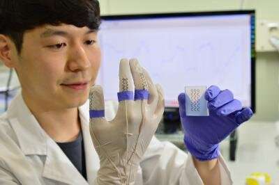 借助KIST后硅半導(dǎo)體研究人員開發(fā)的轉(zhuǎn)移印刷技術(shù),他們正在進(jìn)行實(shí)驗(yàn),通過在實(shí)驗(yàn)手套的頂部安裝高性能傳感器來檢測(cè)手指的運(yùn)動(dòng)。圖片來源:韓國(guó)科學(xué)技術(shù)學(xué)院(KIST)