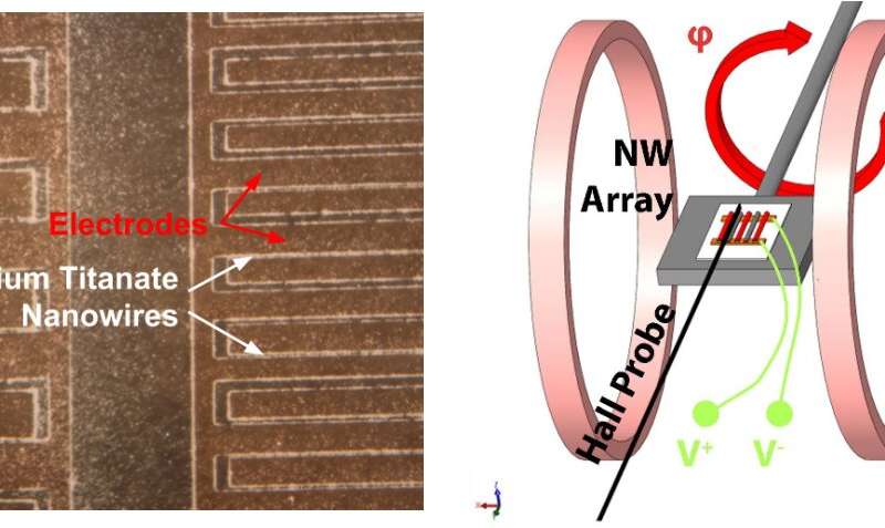 左:鈦酸鋇納米纖維在水中的成功組裝,用稀HCl洗滌除去碳酸鋇后,用檸檬酸懸浮,并在5 kHz和20 Vpp下將pH調(diào)節(jié)至9。右:旋轉(zhuǎn)磁電測量設置的示意圖,其中可以調(diào)整陣列相對于所施加磁場的角度,以探索感應對測得的磁電系數(shù)的影響。圖片來源:佛羅里達大學