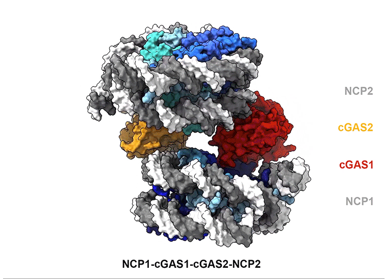 夾在兩個核小體之間的抑制cGAS(紅色和金色)的3D動畫。圖片來源:弗里德里!っ仔獱柹镝t(yī)學(xué)研究所