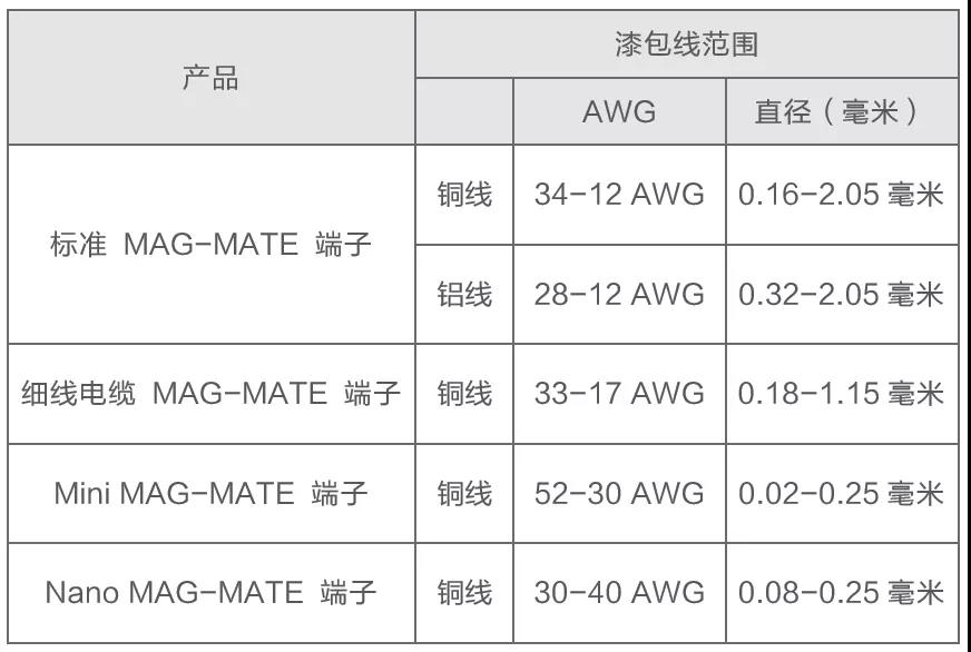 在全系列的標(biāo)準(zhǔn)MAG-MATE絕緣刺破壓接(IDC)端子基礎(chǔ)上新增的新型Nano MAG-MATE端子“小”出新高,適配于30-40 AWG(直徑0.08-0.25 mm)的單線或雙線端接銅漆包線,可以提供清潔、可靠、經(jīng)濟(jì)高效的解決方案,非常適合小型電機(jī)、步進(jìn)電機(jī)或小型線圈應(yīng)用。
