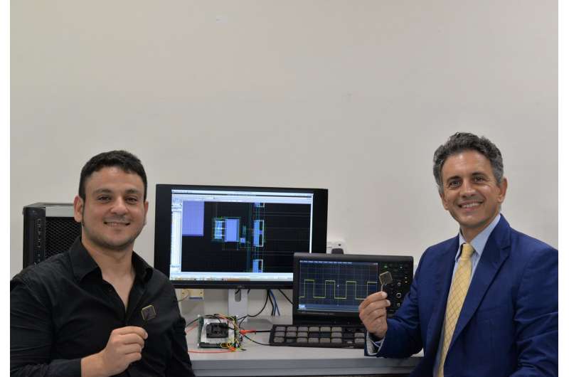 NUS研究人員發(fā)明了一種低成本的“無(wú)電池”喚醒定時(shí)器,可將IoT傳感器節(jié)點(diǎn)的功耗降低1000倍,從而有助于持久運(yùn)行。喚醒定時(shí)器嵌入在測(cè)試芯片中,并放置在較大的封裝中(由兩個(gè)研究人員持有),以便于測(cè)試和表征。左起:新加坡國(guó)立大學(xué)工程學(xué)院的Orazio Aiello博士和Massimo Alioto副教授