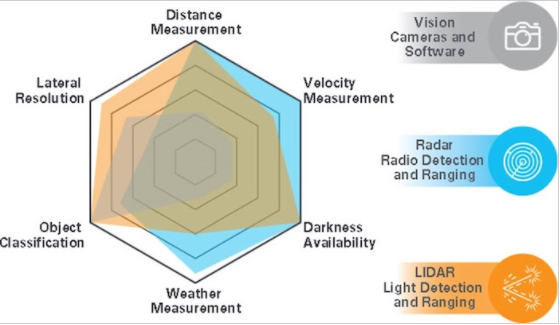 視覺、雷達和激光雷達的比較。圖片由ADI 公司提供