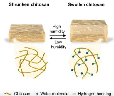 POSTECH 研究人員聲稱(chēng),這種殼聚糖(一種可生物降解的聚合物)水凝膠薄膜可以像超級(jí)海綿一樣快速膨脹和收縮:它可以吸收其周?chē)?1,000 重量百分比的干重的水分。這種高吸水性質(zhì)量來(lái)自水分子和殼聚糖聚合物之間的氫鍵。
