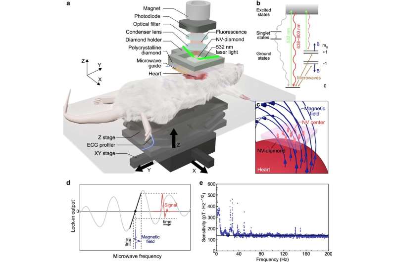 在近期發(fā)表在Communications Physics上的一項(xiàng)研究中,由日本東京工業(yè)大學(xué)(Tokyo Tech)的 Takayuki Iwasaki 副教授領(lǐng)導(dǎo)的一組科學(xué)家現(xiàn)在已經(jīng)開發(fā)出一種新的裝置來執(zhí)行更高分辨率的 MCG。他們的方法基于包含氮空位的金剛石量子傳感器,這些空位充當(dāng)特殊的磁性“核心”,對(duì)心臟電流產(chǎn)生的微弱磁場(chǎng)敏感。