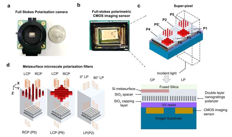 a,全斯托克斯偏振相機的圖像旁邊的一美元硬幣(鏡頭未連接)。b全Stokes偏振CMOS成像傳感器圖像c頂部:芯片集成全Stokes CMOS偏振成像傳感器的3D概念圖。其中P1-P4分別表示傳輸軸為0°、90°、45°、135°的LP濾波器。P5、P5′和P6、P6′分別表示右手圓偏振(RCP)和左手圓偏振(LCP)的手性超表面濾光片。這里P5和P5', P6和P6'在維度上是相同的。下圖為芯片集成偏振成像傳感器二維截面圖。d分別負責傳輸RCP光和LCP光的一對手性超表面(P5, P6)和LP濾波器(P2)的三維概念圖。致謝:左佳偉、白靜、崔shinhyuk、Ali Basiri、陳夏輝、王超、姚宇