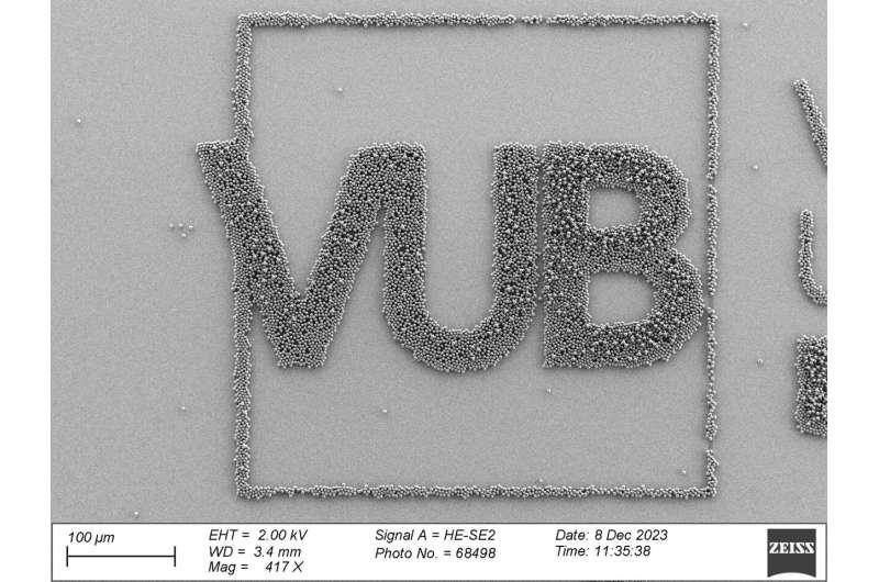 以 VUB 徽標的受控形狀打印的微粒的 AFM 圖像。鱗片是100μm,是人類頭發(fā)的厚度。圖片來源:伊格納斯·吉米達爾