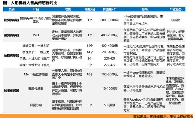 人形機(jī)器人感知模塊包括視覺傳感器、位覺傳感器、運(yùn)控傳感器和觸覺傳感器。從市場(chǎng)空間看,若2030年人形機(jī)器人全球量產(chǎn)116萬臺(tái),考慮特斯拉市占率65%,并考慮降價(jià),曾朵紅等人預(yù)期運(yùn)控傳感器中的六維力矩傳感器市場(chǎng)空間230億>觸覺傳感器100億。