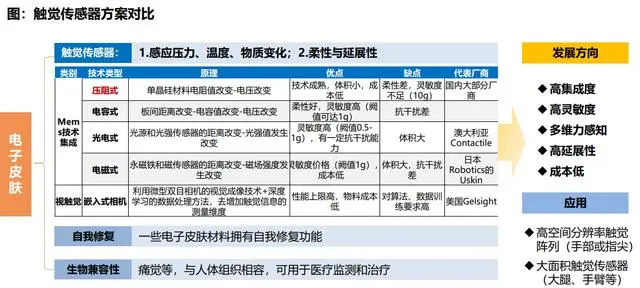 人形機(jī)器人觸覺傳感器包括兩種類型,技術(shù)路線眾多,一是基于Mems技術(shù)集成的觸覺傳感器,包括壓阻式、電容式、光電式、電磁式,二是視觸覺傳感器。MEMS壓阻式觸覺傳感器技術(shù)成熟,目前應(yīng)用較廣,曾朵紅等人預(yù)計(jì)短期是機(jī)器人觸覺傳感器先放量技術(shù)。其采用MEMS技術(shù)排列密集,集成度高,體積小,技術(shù)成熟,成本低。制造精度不同,價(jià)格從幾十至上千不等,進(jìn)口產(chǎn)品單點(diǎn)售價(jià)近千元。