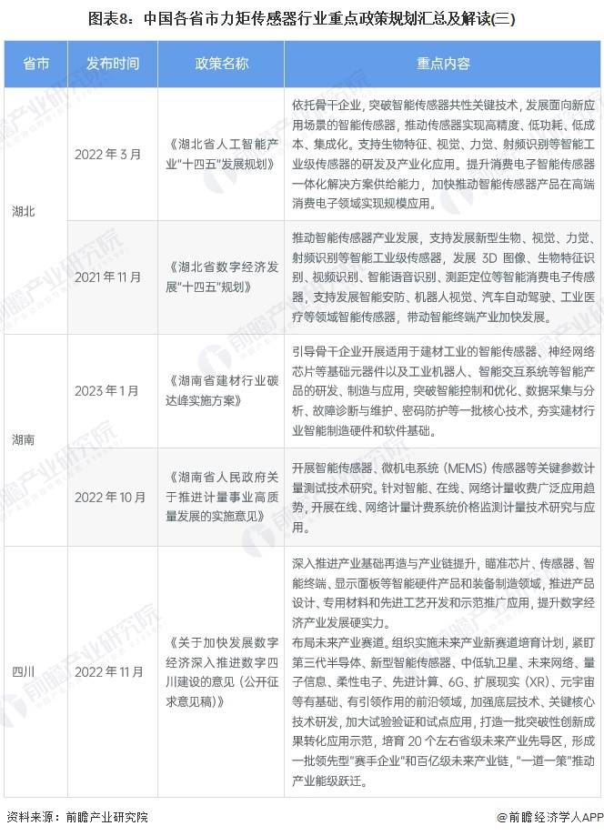 各地政策在傳感器方面發(fā)布的政策較多。盡管針對力矩傳感器的具體政策條文,但是力矩傳感器在高端裝備等領(lǐng)域應(yīng)用更加廣泛,因此各地政策主要鼓勵(lì)企業(yè)加強(qiáng)新型傳感技術(shù)研發(fā),高端、智能傳感器技術(shù)的突破!逗邶埥 笆奈濉睌(shù)字經(jīng)濟(jì)發(fā)展規(guī)劃》中提出推進(jìn)光學(xué)傳感器、慣性傳感器、壓電傳感器、電感傳感器等功能集成與規(guī)模應(yīng)用,實(shí)現(xiàn)智能傳感器一體化生產(chǎn)!稄V西工業(yè)和信息化高質(zhì)量發(fā)展“十四五”規(guī)劃》中提出發(fā)展光學(xué)傳感器、慣性傳感器、汽車壓力傳感器、激光雷達(dá)、氣體傳感器、圖像傳感器和生物傳感器等智能傳感器。