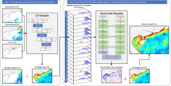 該研究結(jié)合最優(yōu)插值(OI)方法和深度學(xué)習(xí)網(wǎng)絡(luò)框架(SwinUnet),構(gòu)建了基于數(shù)據(jù)異常預(yù)期方差的深度學(xué)習(xí)模型——OI-SwinUnet。該方法利用最優(yōu)插值,基于空間鄰域信息,融合衛(wèi)星觀測和現(xiàn)場觀測數(shù)據(jù),并利用SwinUnet對(duì)大區(qū)域長時(shí)序的遙感觀測時(shí)間序列數(shù)據(jù)進(jìn)行多尺度特征學(xué)習(xí),重建缺失的葉綠素a濃度數(shù)據(jù),進(jìn)而獲得南海區(qū)域逐日1km海表葉綠素產(chǎn)品。