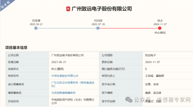 隨著經(jīng)濟(jì)環(huán)境的變化和金融政策的收窄,2024年以來,已有多家傳感器企業(yè)IPO終止。 11月7日,深圳證券交易所公告顯示,又有一家中國傳感產(chǎn)業(yè)鏈知名企業(yè)——廣州致遠(yuǎn)電子股份有限公司(下文簡稱“致遠(yuǎn)電子”)IPO終止。 從上市信息看,致遠(yuǎn)電子于2023年6月21日向深交所提交IPO申請獲受理,2023年7月18日獲問詢,并于2024年11月7日終止IPO審核,終止原因?yàn)椤皬V州致遠(yuǎn)電子股份有限公司、保薦人撤回發(fā)行上市申請”。本次致遠(yuǎn)電子IPO的保薦機(jī)構(gòu)