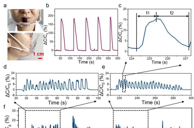 (a) 佩戴在受試者臉上的商用口罩上的濕度傳感器照片。(b) 受試者在休息狀態(tài)下用嘴進行的人體呼吸測試。(c) 傳感器的響應(yīng)和恢復(fù)時間。(d)-(f) 受試者在休息狀態(tài)下用鼻子實時監(jiān)測呼吸頻率。實時監(jiān)測手掌濕度,(g) 飲用熱水時和 (h) 鍛煉時的情況。圖片來源:《光電子進展》(2023 年)。DOI: 10.29026/oea.2023.220172