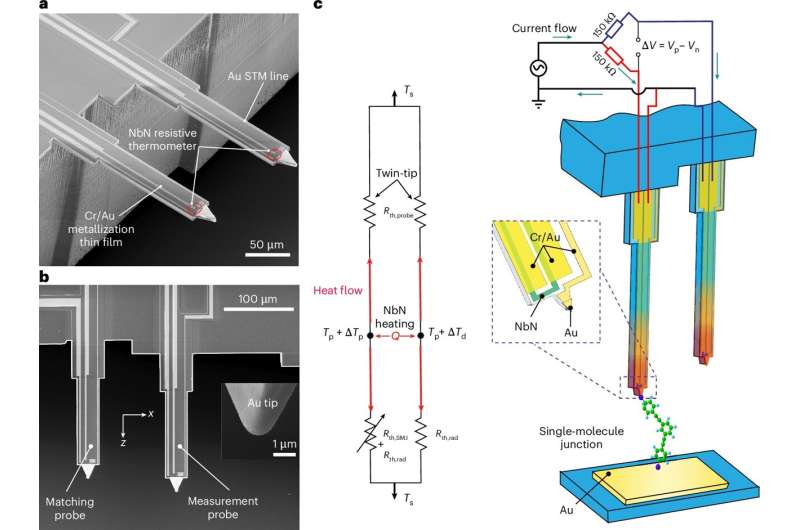 用于單分子熱測量的雙尖端氮化鈮掃描熱顯微鏡(SThM)探針。a. 雙尖端掃描熱顯微鏡探針的掃描電子顯微鏡(SEM)圖像(側(cè)視圖),在兩個幾何形狀相同的梁上有氮化鈮溫度計,并配有用于電流測量的鉻 / 金金屬化層和金電極線。b. 探針的掃描電子顯微鏡圖像(俯視圖),顯示了雙尖端的接近程度(在 z 方向上偏移 20 微米)。插圖:鍍金尖端的末端。c. 用于量化單分子結(jié)熱導(dǎo)率的測量方案示意圖,單分子結(jié)被困在金樣品和雙尖端探針的較長尖端之間。使用全惠斯通電橋電路來測量由通過分子結(jié)的熱流引起的兩個尖端之間的溫差。一個熱阻網(wǎng)絡(luò)展示了從探針到散熱器的熱流(Q)路徑。這里 Rth,SMJ=1/Gth,SMJ,Rrad 是與環(huán)境的輻射熱阻。圖片來源:《自然材料》(2025 年)。DOI: 10.1038/s41563-025-02195-w