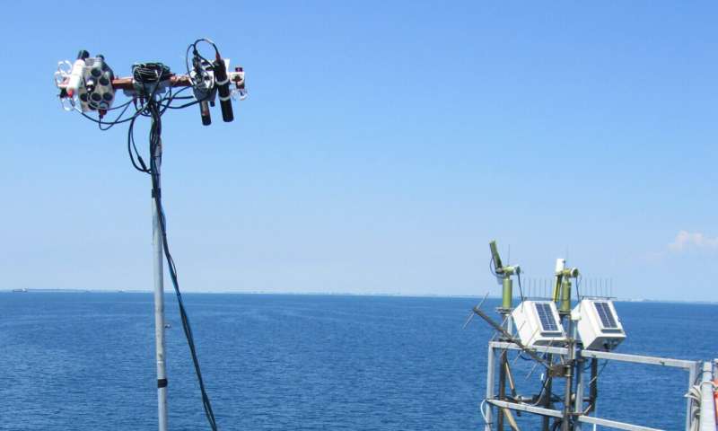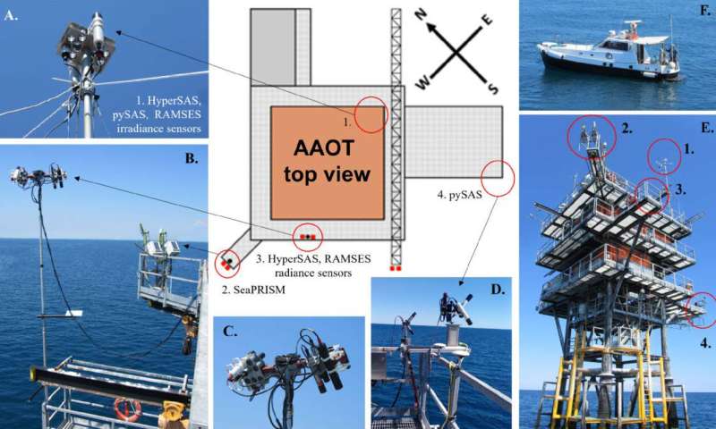 亞得里亞海平臺上對一些最常用的科學(xué)光學(xué)傳感器(輻射計)進(jìn)行了為期 10 天的測試。圖片來源:普利茅斯海洋實驗室