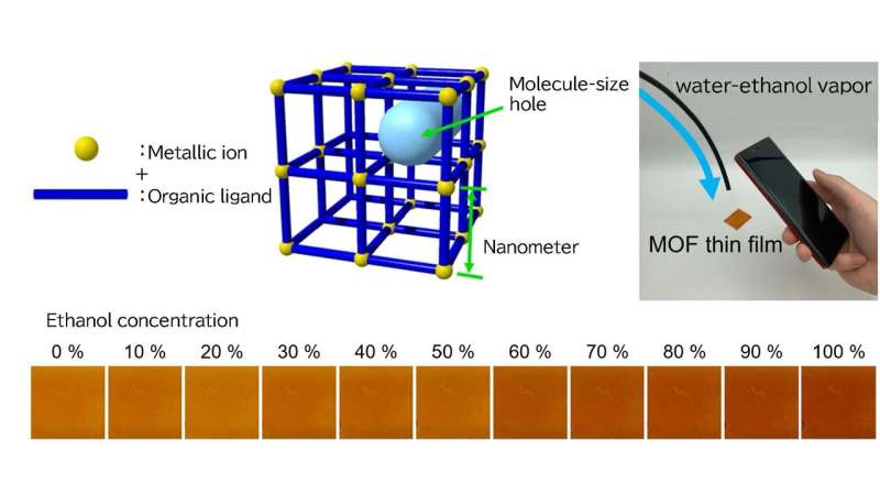 這些金屬有機(jī)框架(MOF)含有納米級(jí)孔隙,可吸收乙醇分子并通過可見的顏色變化作出響應(yīng) —— 這一現(xiàn)象被稱為溶劑化 / 蒸氣致色效應(yīng)。得益于低光散射特性和高透明度,Cu-MOF-74 薄膜無需復(fù)雜實(shí)驗(yàn)室設(shè)備即可實(shí)現(xiàn)精確光學(xué)測(cè)量。