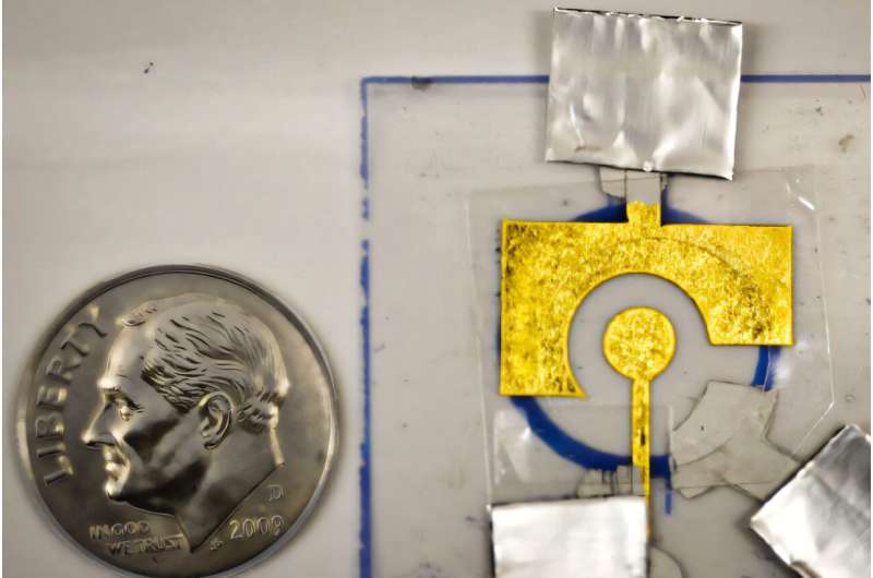 阿里爾・弗斯特實(shí)驗(yàn)室開(kāi)發(fā)的電化學(xué)傳感器由附著在廉價(jià)金箔電極上的 DNA 組成,該電極被層壓在塑料片上。圖片來(lái)源:研究人員提供;麻省理工學(xué)院新聞編輯